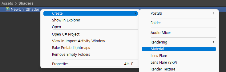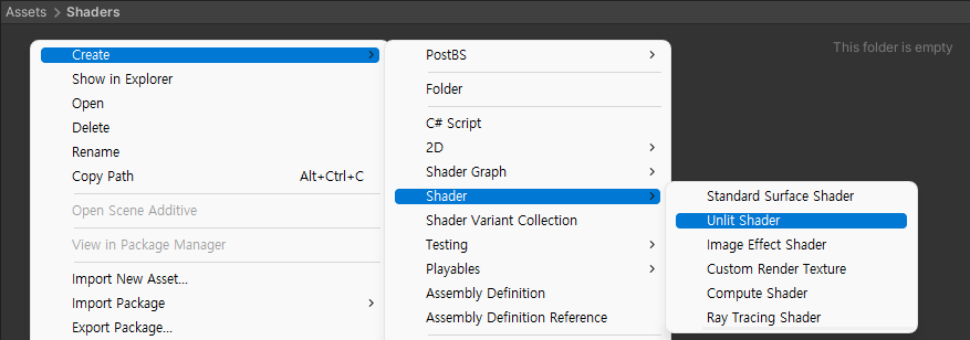 유니티의 프로젝트 윈도에서 원하는 위치로 이동 후 오른 클릭 해서 Create → Shader → Unlit Shader 로 셰이더를 만듭니다.